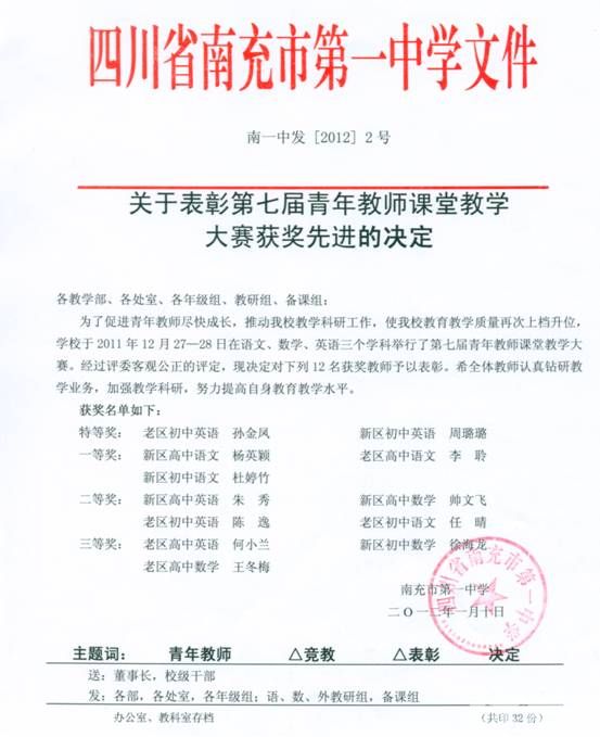 南充一中关于表彰第七届青年教师课堂教学大赛获奖先进的决定