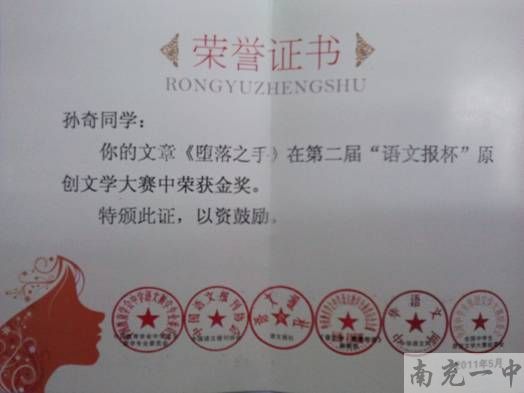 高2013级8班孙奇同学《堕落之手》荣获全国原创文学大赛金奖