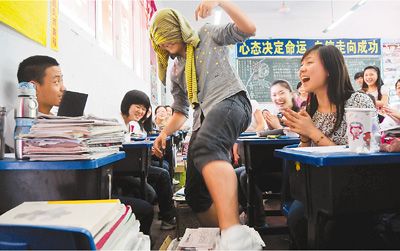 5月14日,四川省南充一中高三学生在教室里做“跨越障碍”游戏。随着高考的临近,四川省南充一中针对高三学生开展多种游戏活动,让考生释放紧张心情,以乐观的心态迎接高考。