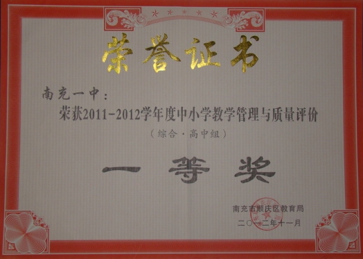 南充一中喜获顺庆区2011—2012学年度教学管理与质量评价(综合·高中组)一等奖