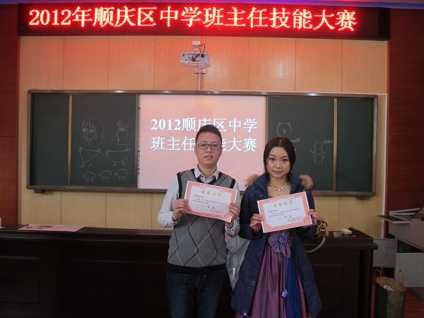 南充一中青年教师杨麒伟、王晓凤二位优秀班主任代表我校参加顺庆区2012年中学班主任技能大赛,充分展示了我校班主任教师的风采,以绝对优势力压群雄,分别荣膺特等奖和一等奖!