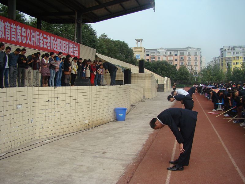 2012年10月20日上午,我校新区邀请到了中国感恩教育首席讲师、彭成感恩教育忠义讲师、全国近百所大中小学校的荣誉校长、德育顾问余云老师忠义讲师余云老师到校作感恩教育报告会,新区高一、初一老师和学生家长共4000多人聆听了报告会。余云老师以感人肺腑的演讲,让师生和家长受到了一次强烈的心灵震撼,接受了一次终生难忘的感恩教育洗礼。