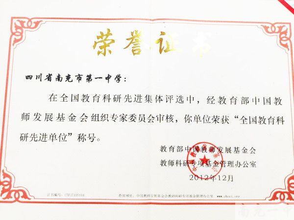 南充一中荣获“全国教育科研先进单位”称号