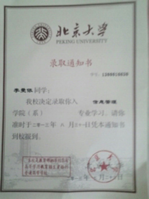 热烈祝贺我校高2013届13班李曼依同学被北京大学信息管理与信息系统专业录取