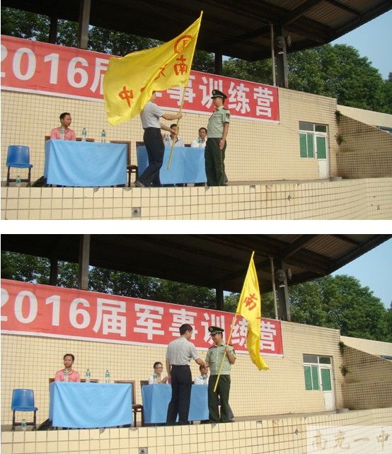 在何云超助理、闫指导员的动员鼓舞下,高2016级全体新生热血沸腾、斗志昂扬。随后进行了庄严神圣的授旗仪式。闫文斌指导员接过领导手中的军旗,脸上洋溢着灿烂的微笑和坚定的神情。最后宋奎瑞校长宣布“南充一中高2016级新生军训开训”,这一幕感动了在场的所有师生,为本次的军训开营仪式划下了圆满的句号,高2016级新生精神抖擞地投入到为期三天的军训当中。