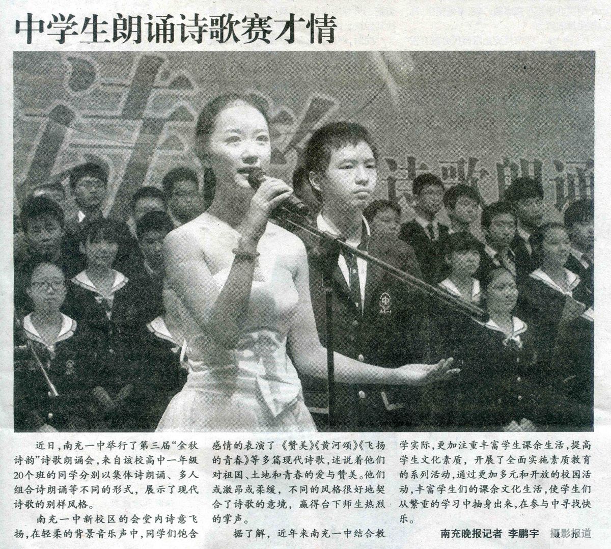 南充一中新校区的会堂内诗意飞扬,在轻柔的背景音乐声中,同学们饱含感情的表演了《赞美》《黄河颂》《飞扬的青春》等多篇现代诗歌,述说着他们对祖国、土地和青春的爱与赞美。他们或激昂或柔缓,不同的风格很好地契合了诗歌的意境,赢得台下师生热烈的掌声。