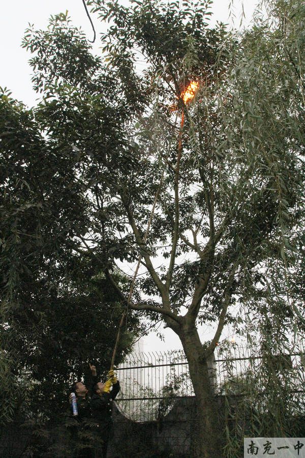 11月7日下午,顺庆区消防中队接到南充一中求助电话称,南充一中华凤校区一大树上发现一个直径至少100cm的巨型马蜂窝。接到报警后该中队立即派出三名官兵前往现场除害。一根高约8米的树上一巨大蜂窝悬挂在树梢,进进出出的马蜂忙得是“不亦悦乎”,严重威胁到南充一中华凤校区8000余名师生的生命安全,现场指挥员立即制定出除蜂方案“火攻”,在学校保卫科工作人员的协助下很快找来一根长竹竿、一套旧衣服、,消防官兵熟练的在竹竿上绑上旧衣服浇上汽油,简易的“除蜂利器”制作成功,当高温的火苗威胁到马蜂生命时马蜂纷纷向外涌出做“殊死搏斗”,在高温的火苗下这无疑是“飞蛾扑火”,掉下来的马蜂窝残巢马上被杀虫剂灭杀,很快猖狂一时的马蜂被官兵成功“围剿”。