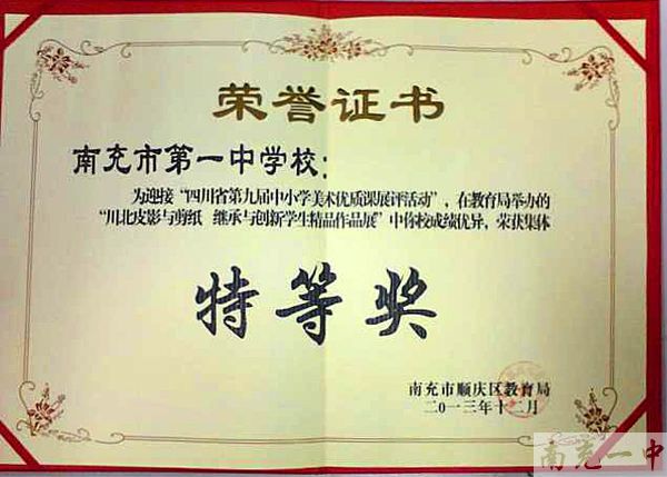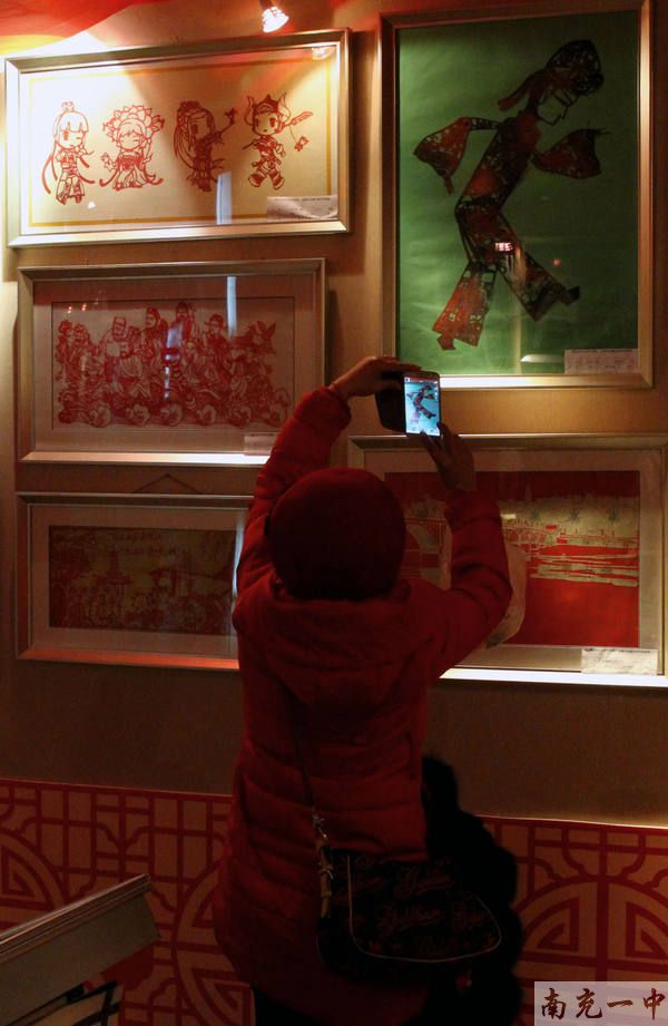 在刚刚结束的“川北皮影与剪纸 继承与创新学生精品作品展”中,我校学生的皮影和剪纸作品以独有的创新方式,精湛的工艺技术获得了集体特等奖的荣誉。此次活动是为迎接“四川省第九届中小学美术优质课展评活动”,顺庆区教育局于2013年12月13日至20日在西华师范大学美术学院的展厅内组织举办的大型展览活动,展出期间,我校展区一袭火红色的传统装扮吸引了大量观众驻足观看,拍照留影。省、市、区各级领导也到我校展区参观,对我校的学生作品给予了高度的评价,并提出了宝贵的意见和建议。