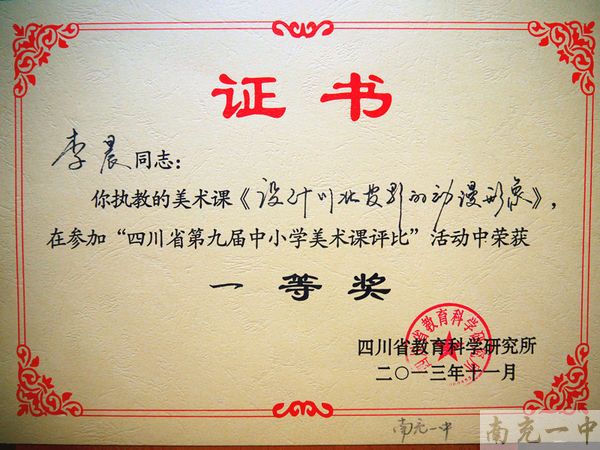 我校教师李晨在四川省第九届中学美术教师优质课竞赛中获得一等奖