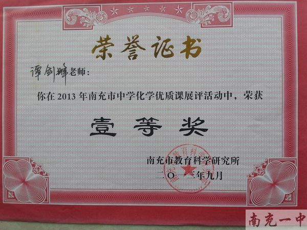 在2013年南充市中学化学优质课展评活动中,我校化学教师谭剑锋荣获一等奖