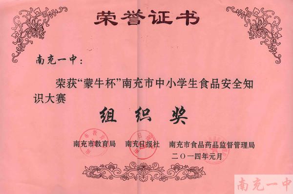 南充一中荣获“蒙牛杯”南充市中小学生食品安全知识大赛组织奖