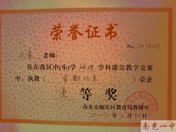 全国广东.地质版初中《地理》优质展评王青老师获得南充市顺庆区初中地理一等奖