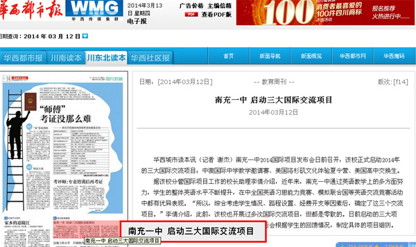 华西城市读本讯(记者 谢杰)南充一中2014国际项目发布会日前召开,该校正式启动2014年的三大国际交流项目:中澳国际中学数学邀请赛、美国洛杉矶文化体验夏令营、美国高中交换生。