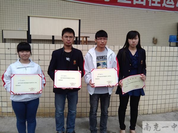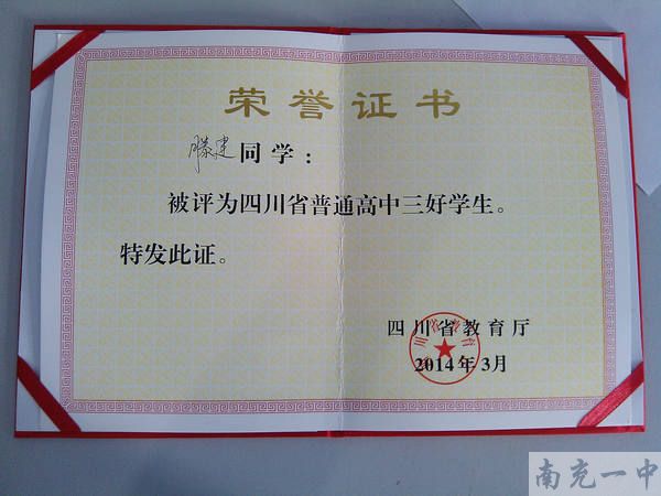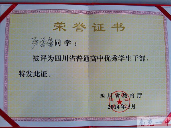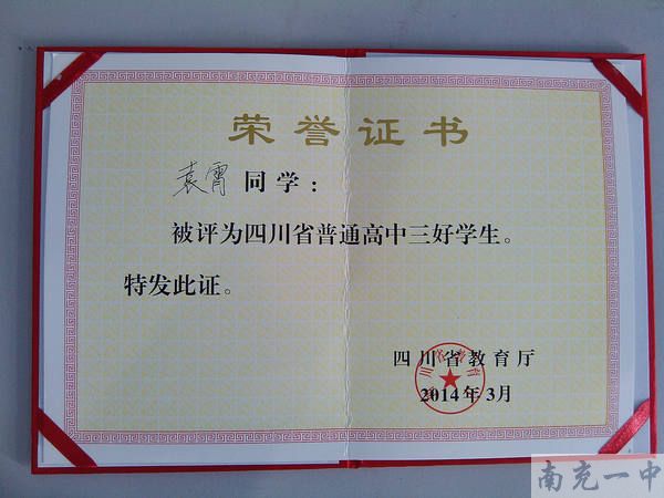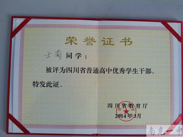 在2014年四川省普通高中省级三好学生评选中,我校高三(9)班王菊同学、袁霄同学、高三(10)班滕建同学、高三(18)班张誉馨同学被四川省教育厅表彰为四川省优秀学生干部和四川省三好学生。