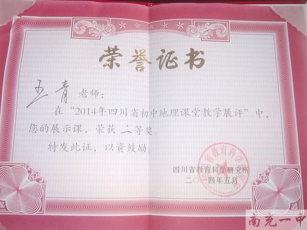 四川省初中地理课堂教学展评活动我校王青老师荣获省级二等奖