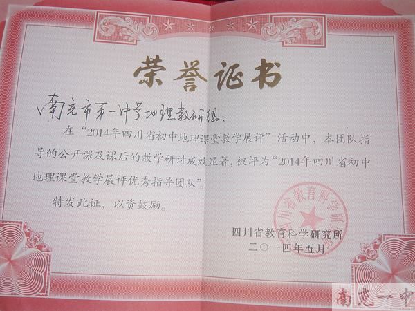 我校南充一中地理教研组获得四川省初中地理课堂教学展评活动优秀指导团队称号