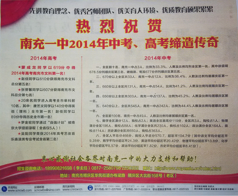 南充晚报刊登“先进教育理念、优秀名师团队、优美育人环境、优质教育硕果累累”新闻