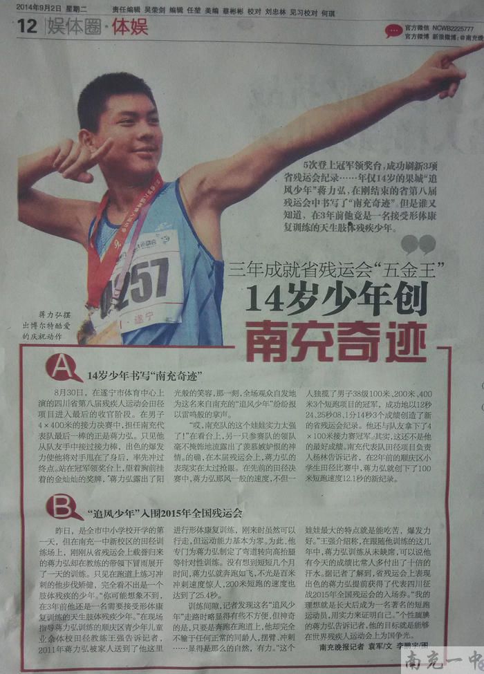 南充晚报刊登“南充一中初二九班蒋力弘同学创南充奇迹”
