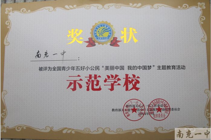 2014年的活动主题是“美丽中国 我是中国梦”我校关工委在校行政、党委的领导下,积极组织初一、高一学生参加此项主题教育系列{读书、征文、演讲比赛}:2014年4月在顺庆区教育局关工委举办的主题教育读书演讲比赛中我校高2015届5班蒋聪同学荣获一等奖;组织初一、初二学生参加国家教育部关工委主办的读书教育征文比赛荣获国家级奖8 人,省级将 12人,市级奖12人,区级奖25人。此项活动的开展促进了校园精神文明建设,增强了青少年学生的爱国主义意识,激励学生为实现美丽的中国梦而努力学习!