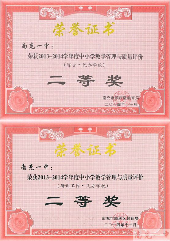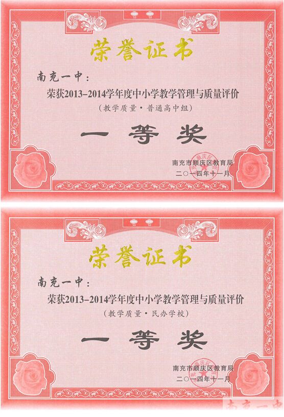 南充一中在2013—2014学年度,全面贯彻教育方针,狠抓教育教学质量,重视教育教学过程管理,立足基础教育课程改革,深入推进素质教育,取得了显著成绩。在南充市顺庆区2013—2014学年度教学管理和质量评价中,获得:综合·高中组一等奖、教学质量·普通高中组一等奖、教学质量·民办学校一等奖、综合·民办学校二等奖(一等奖空缺)、研训工作·民办学校二等奖(一等奖空缺)。