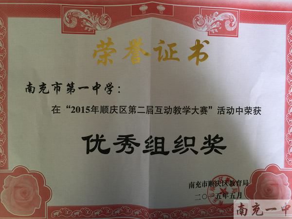 2015年由南充市顺庆区教育举办的“第二届互动教学大赛”,南充一中荣获优秀组织奖。我校能获得此项殊荣是全校师生共同努力的结果。