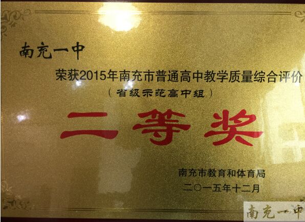 2015年南充市普通高中教学质量评价结果揭晓,我校又一次凭借优异的高考成绩和过硬的办学质量上交了一份满意的答卷。在全市十二所省级示范高中里我校位居第6名,获得了南充市教学质量评价二等奖。这已是我校连续多年获此殊荣。