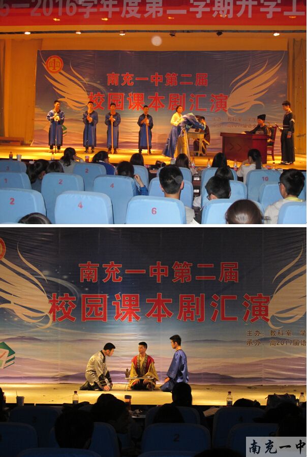 为了丰富校园文化生活,提高同学们对文学、戏剧的兴趣,4月18日由南充一中教科室、学生处主办,高二年级语文组承办的“南充一中第二届校园课本剧文艺汇演”活动在食堂三楼顺利举办,并于晚上十点四十完美谢幕。