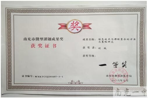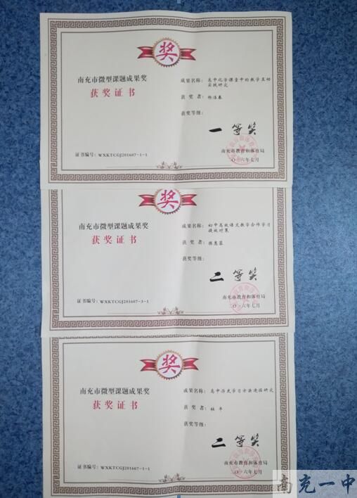 沐浴着秋日的阳光,满怀着收获的喜悦, 9月20日,市区微型课题研究成果奖揭晓,我校选送的11个微型课题全部获奖:其中杨浩春老师的《高中化学课堂中的教学互动实践研究》、刘玫老师的《信息技术与课程整合的方法与策略研究》获市一等奖;杜平老师的《高中历史学习方法途径研究》、陈惠蓉老师的《初中高效语文教学合作学习提效对策》获市二等奖;江斌与符杨老师的《高中生地理作业设计和批改方式的研究》、陈清方与敬兴鑫老师的《高中生数学学习兴趣、思维品质及学业成绩之间关系的研究》、周春玲与王权老师的《如何培养中学生在物理解题中“咬文嚼字”的能力》、林怡与张小霞老师的《高中物理实验课教学的研究》、王辉老师的《高中政治教学中学生主动性的调动》、严亮老师的《高中英语分组教学模式》、谭燕与唐莉老师的《高中历史知识点背诵的研究》获区二等奖。