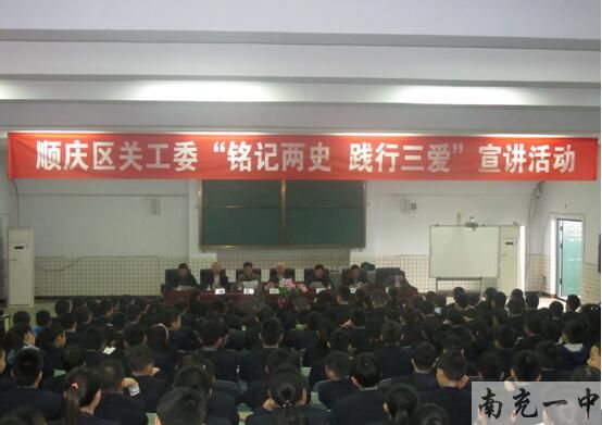 为加强学生对党史国史的了解认识,对学生进行爱国主义教育,激发学生的爱国热忱,10月18日上午,由顺庆区关工委组织的宣讲组莅临南充一中新校区,开展“铭记两史 践行三爱”主题宣讲活动。活动于新区E区六楼会议室开展。初一、初二三百多名学生参加了本次活动。会议秩序良好,学生认真积极。