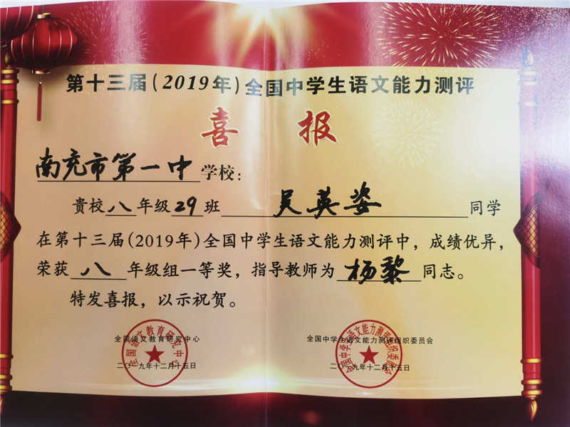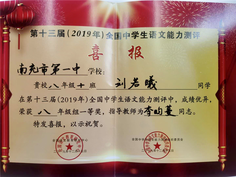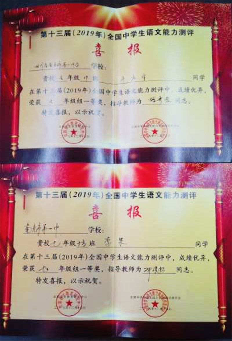 为激励和引导广大青少年从小树立崇高理想和远大志向,2019年,我校组织学生参加了第十三届全国中学生语文能力竞赛。作为具有巨大影响力的中学语文学科综合性质量和成绩的检测活动,是全国中学语文学科的一项重要激励机制。我校初中年级学生在此次竞赛中,获得了可喜的成绩。