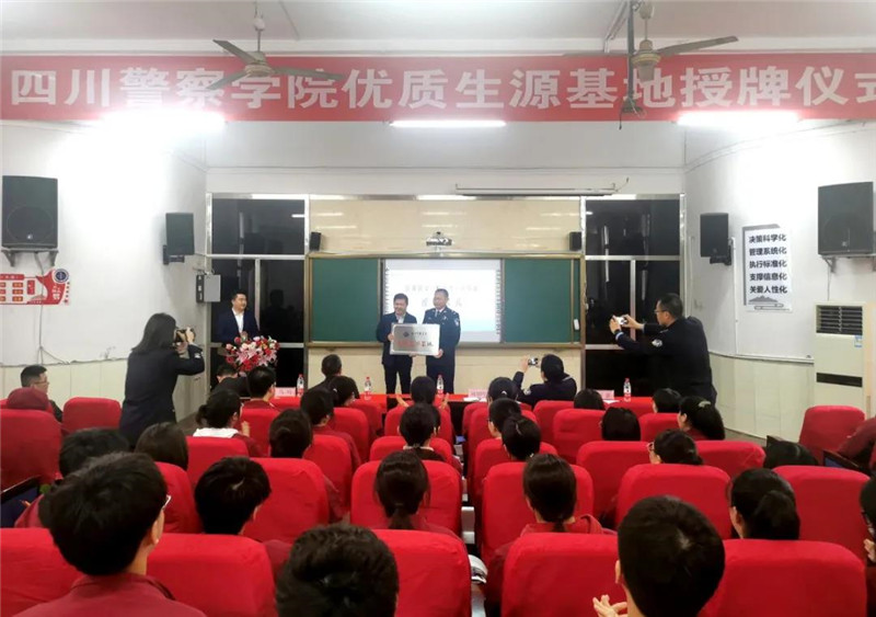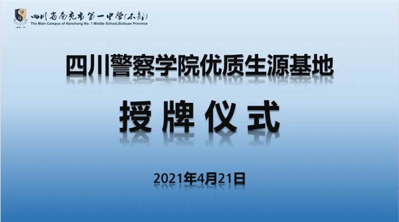 4月21日,四川警察学院优质生源基地授牌仪式在南充一中本部顺利举行。四川警察学院招生就业处处长蒲朝晖、四川警察学院警察管理系副主任朱林兵、四川警察学院成人教育部警察教育训练教研室主任刘嘉、顺庆区教育考试中心主任何建林、省公安厅南充战训基地教官廖茂材、南充一中校长陈平、南充一中本部执行校长马鸣,以及西城派出所全体领导、南充一中部分行政领导及高三年级部分师生参加了此次授牌仪式。