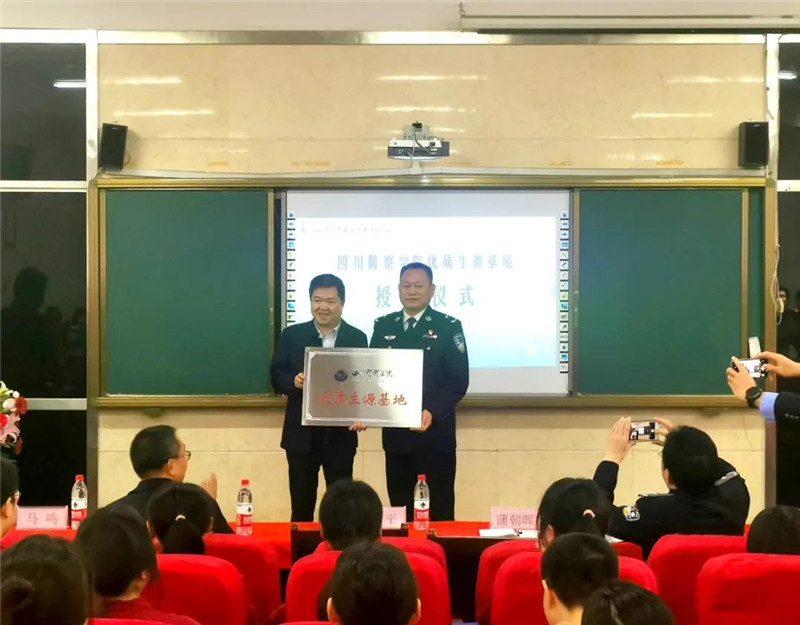 在与会领导、老师的见证下,在热烈掌声中,四川警察学院招生就业处处处长蒲朝晖向南充一中校长陈平授予“四川警察学院优质生源基地”的牌匾。