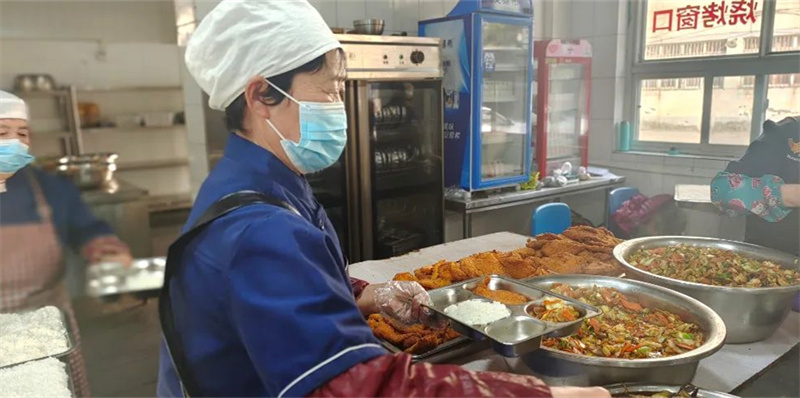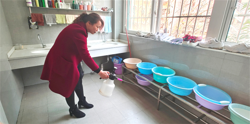 食堂阿姨准备好热腾腾的美味饭菜,扫地阿姨和生活老师对校内和寝室进行消杀