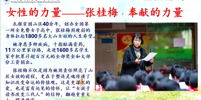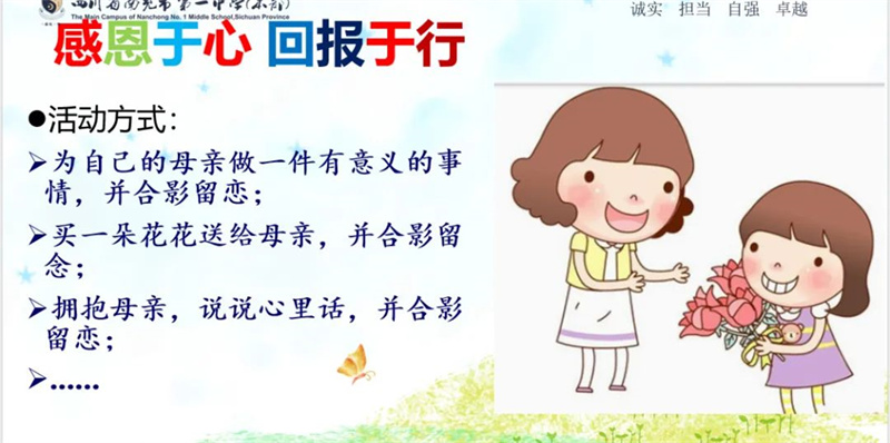 3月7日下午,在南充一中本部学生发展中心的组织下,各班召开了以“妈妈,您辛苦了!”为主题的班会。通过班会,学生了解了三八妇女节的来历和我国著名女性的光辉事迹,树立了尊重女性、关爱女性和保护女性的意识,体会到妈妈和女老师的辛勤付出与殷切期盼,并且在接受爱的同时学会用爱去回报!
