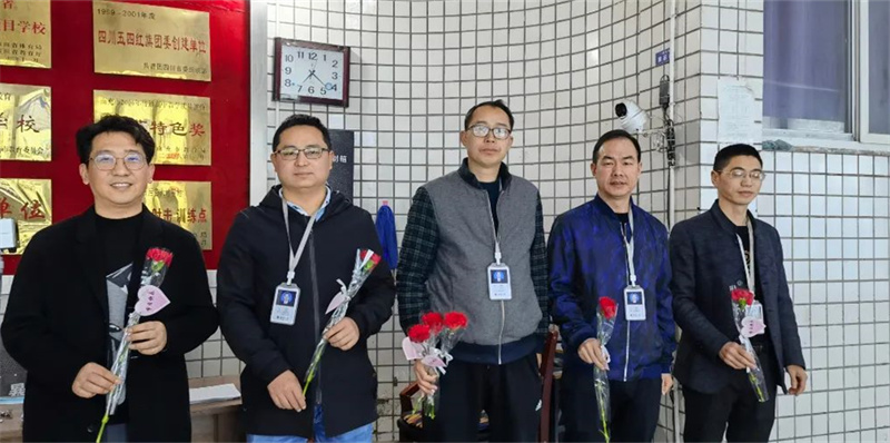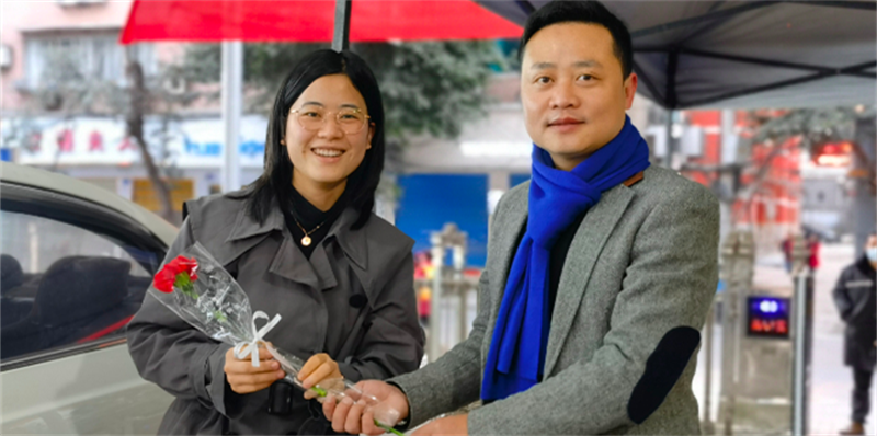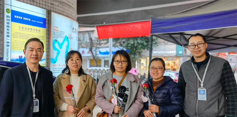 3月8日一早,南充一中本部的“男神”教师们就手持鲜花,站在学校门口迎接“女神”们的到来。