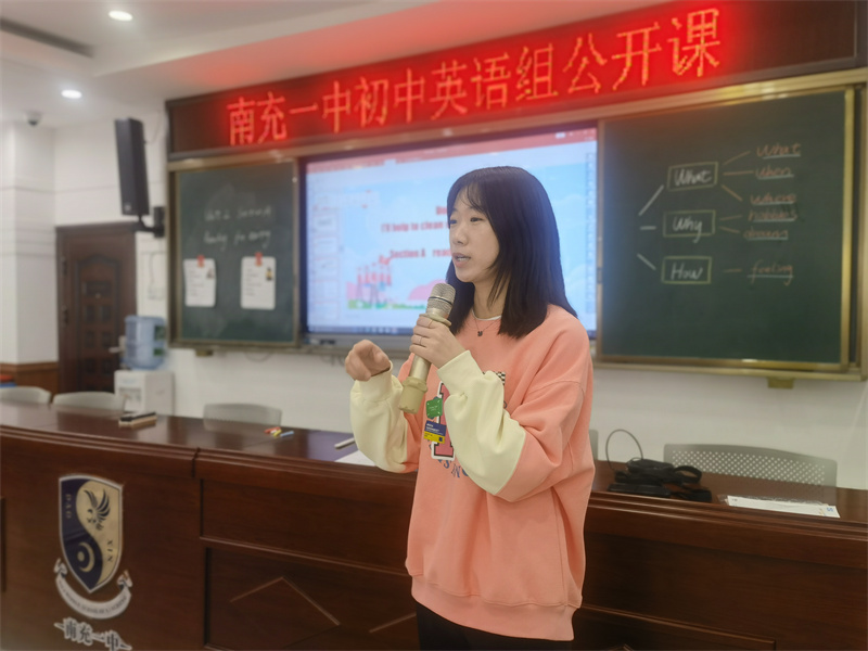 随后,其指导教师及初中英语学科组组长苟莉老师就李梁鸿老师的课堂作了进一步的说明和点评。苟莉组长对李梁鸿老师的快速成长作出了肯定并且倡导其他青年教师在教学过程中要相互学习、取长补短,积极进取,抓住一切机会,提升自己的教学水平。