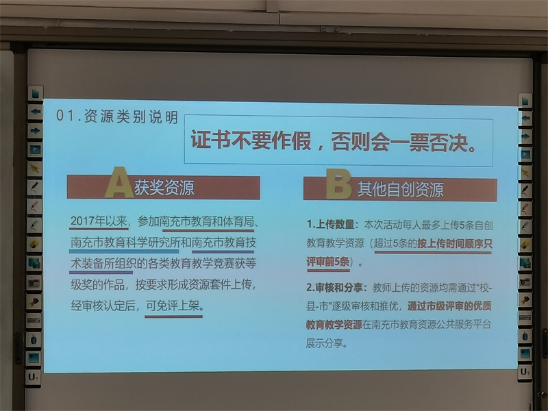 搜心思有效,抽策期称最。期间,阳化冰主任结合本校实际,通过专家讲座、案例分享、工作部署等多种形式,对优质资源上传的具体要求做了详细解读,交流了关于优质教育教学资源研究的设想,落实了此次推进会的工作要求,大家都不约而同地关注到了当下教育热点——“双减”政策。阳主任在讲话中强调,南充市高度重视教育信息化工作,结合中央电化教育馆相关工作启动了本次南充市优质专题数字教育教学资源征集的系列活动。我校全体教师须深入贯彻“顺庆区2022年市级优质教育教学资源征集活动工作会议”中的“教育优先发展”的会议精神,落实立德树人根本任务,将信息技术在教育教学中的融合应用作为推进“教育+互联网”的有效手段,更好地服务课堂教学,服务学生自主学习,提升教师专业素养,满足新时代的教育需求,更加全面地提高我校基础教育质量。春息融融、泉水淙淙般的讲解,为与会教师开展优质教育教学资源的上传工作提供了系统化的指导,醍醐灌顶,获益满盈。