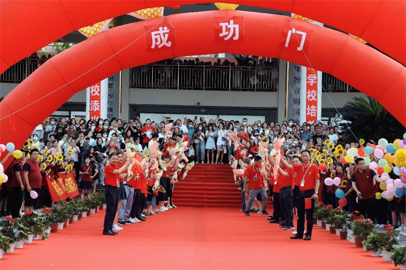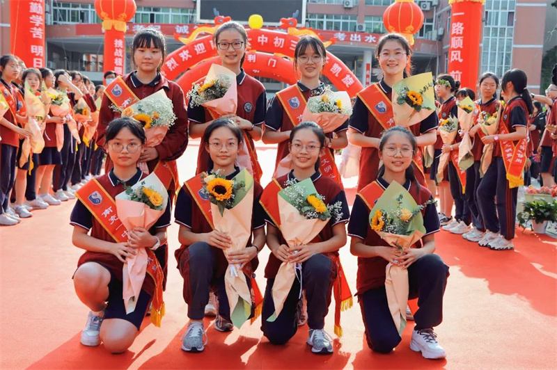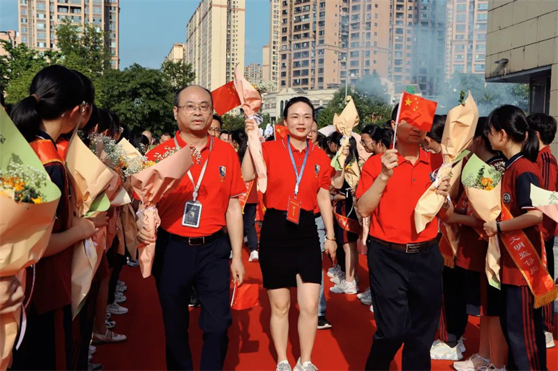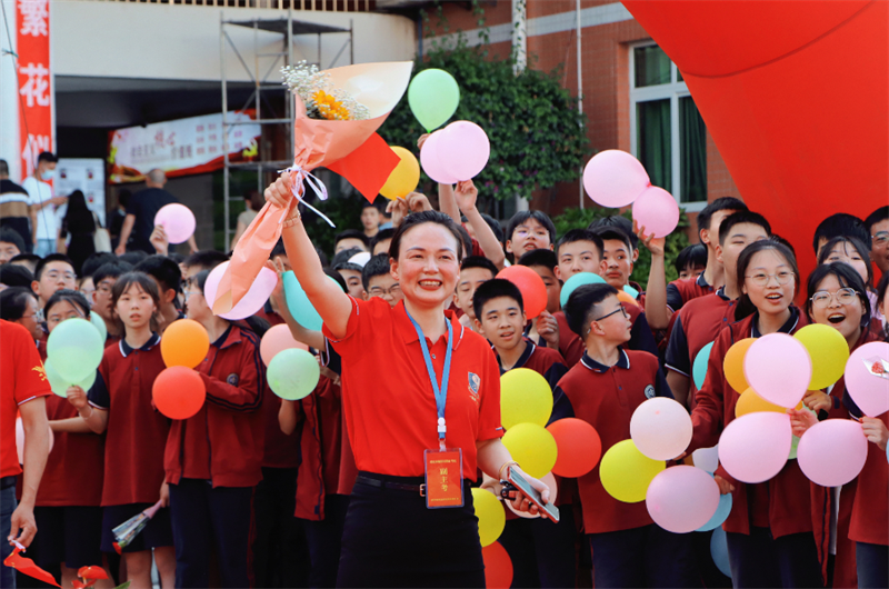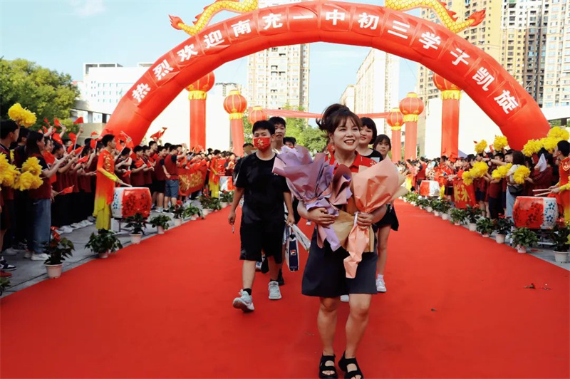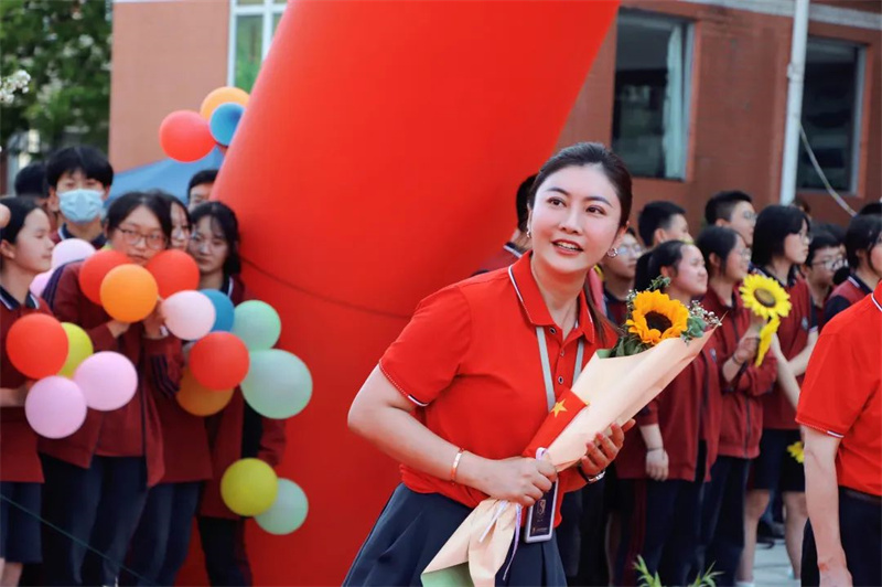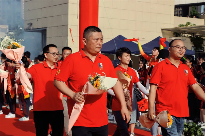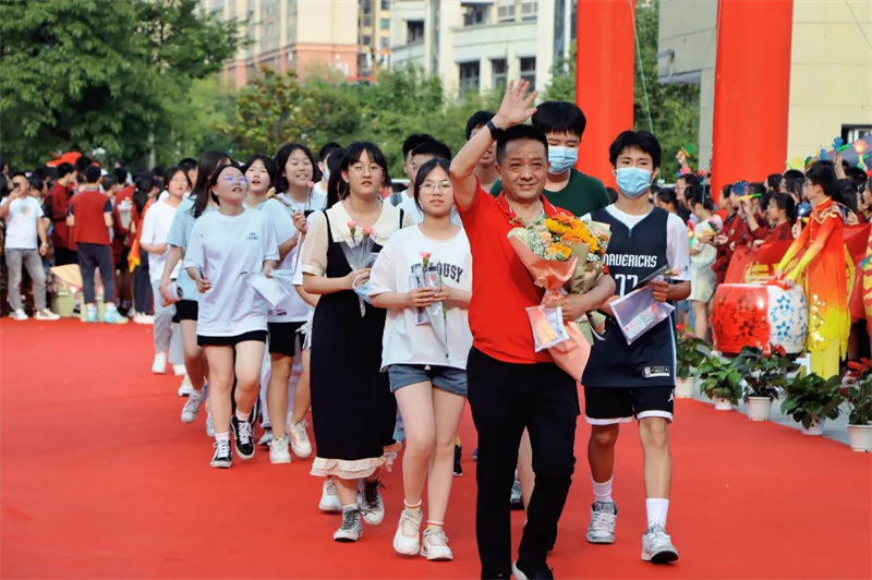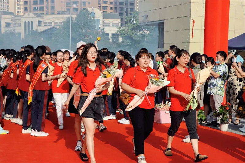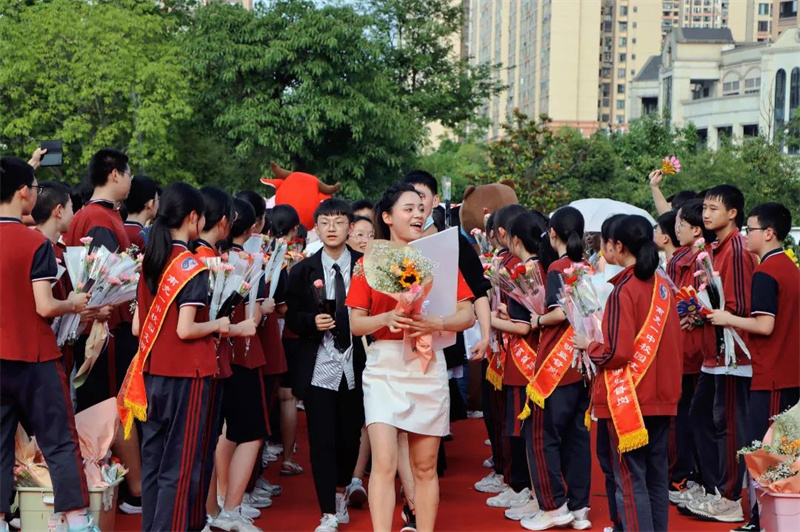 身着“战袍”的初三全体教师笑意盈盈,接过鲜花,走上红毯。