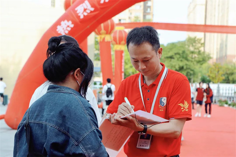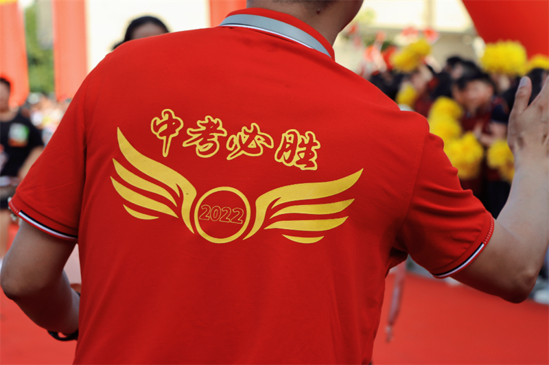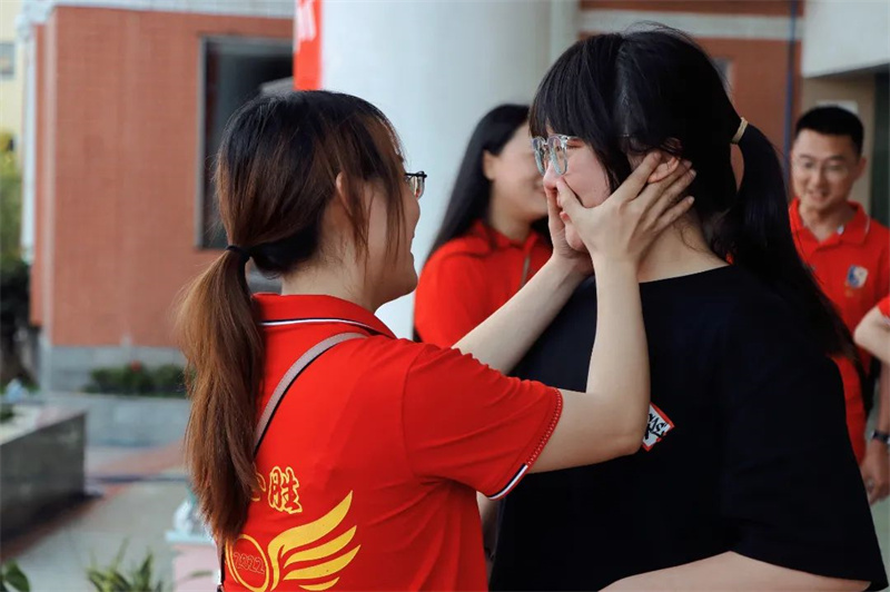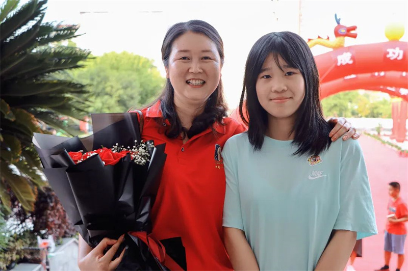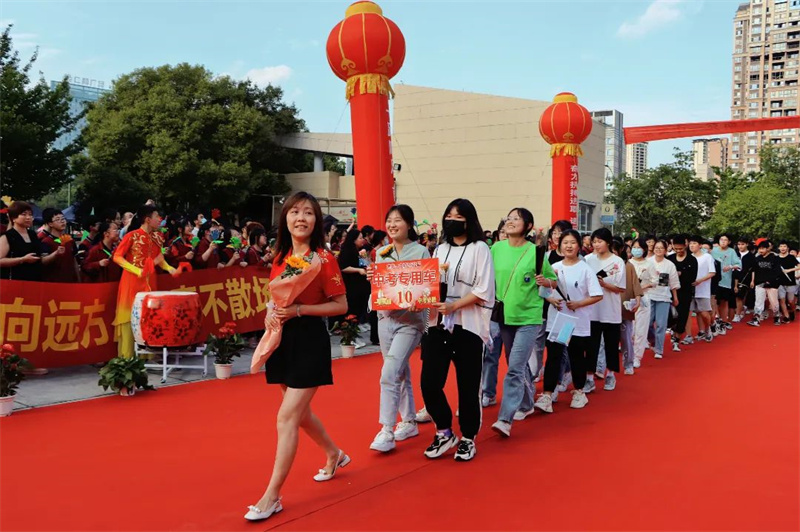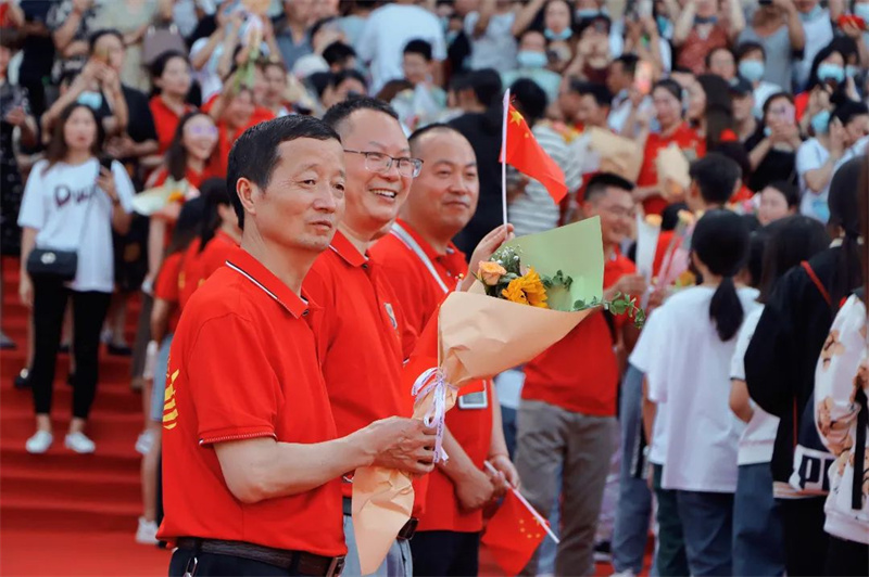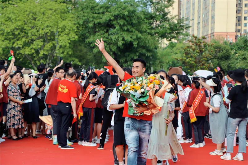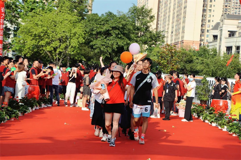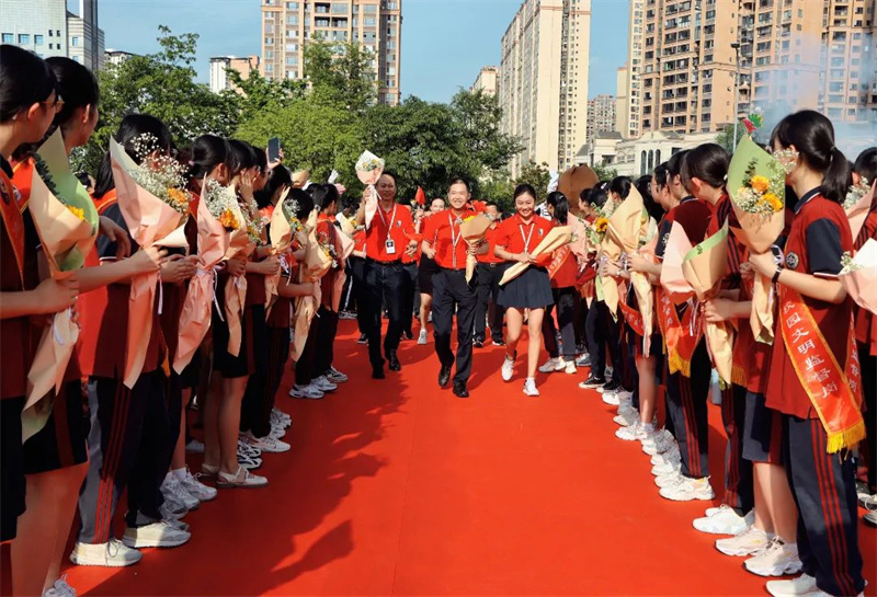 身着“战袍”的初三全体教师笑意盈盈,接过鲜花,走上红毯。