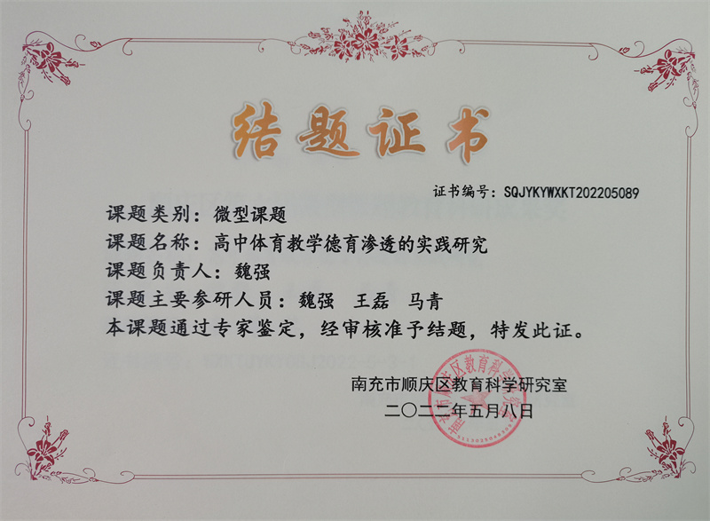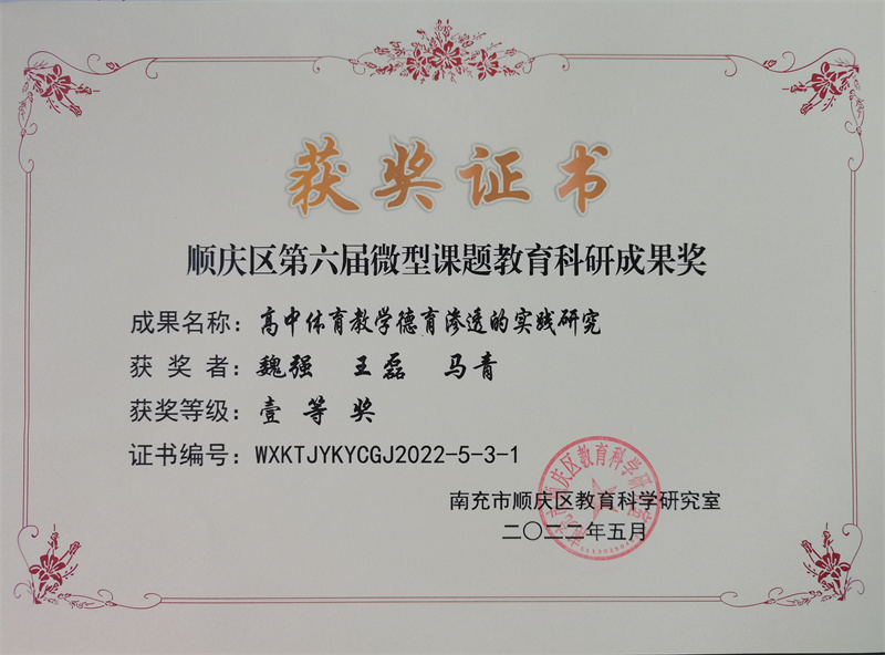 为提升教师教育教学理论素养,锤炼教学基本功,推进课题科研与学科教学深度融合,培养高素质、专业化的师资队伍,全面提高教学质量,根据南充市顺庆区教育科技和体育局的安排,结合我校实际,南充一中教师积极响应,再掀教学研究的热潮。我们与时间赛跑,奏响不忘初心,筑梦课堂的教学主旋律,欣悉捷传,在“南充市顺庆区第六届微型教育科研课题成果”评选活动落幕之际,我校的魏强、王磊、马青三位教师和李凤君、吴诗雨、耿瑞枝三名教师的微型教育科研课题成果分别斩获南充市顺庆区一、二等奖的骄人佳绩。