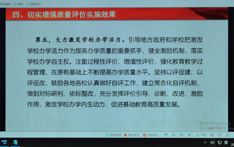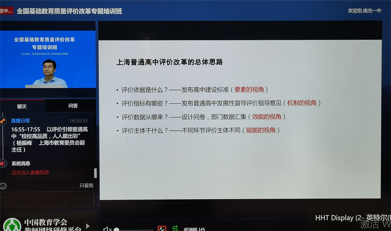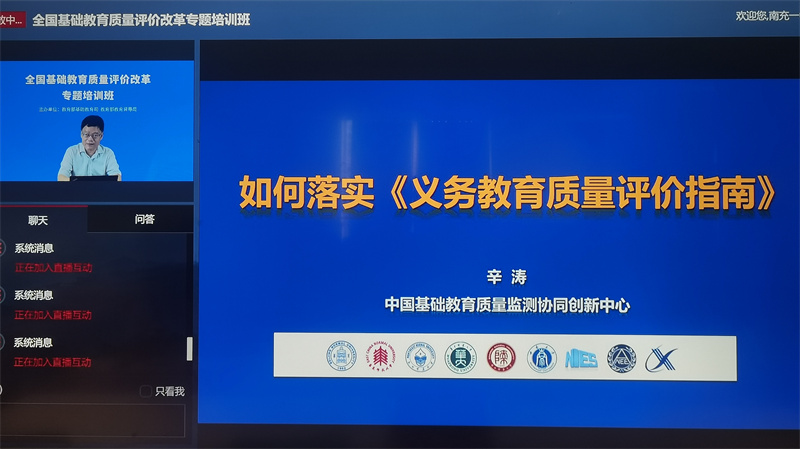 本次培训活动,采用的是“视频”的形式进行。培训的主要内容是“三个指南”背景下的教学管理、学生管理、学校管理,课程管理、教师管理的策略与方式、结果评价与增值评价的实践探索、学校的文化理念与精神等内容。总体上从信息化平台和资源分享两个层面,主要围绕基础教育教学质量报告、推进基础教育高质量发展,以及通过共建共享基础教育质量评价国家数据平台、推进基础教育质量创新发展等方面,对《关于深化新时代教育评价改革总体方案》进行了深层次、全方位的解读,就全国基础教育学段的教师与学生调查结果进行了细致分析和全面总结;剖析了课堂教学与基础教学展示的地位、作用与存在的问题;研讨了贯彻落实的具体思路举指;指出了教育教学资源建设、教育教学融合创新的实效方向和方法,以期推动基础教育深化改革创新,着力提升基础教育质量。号召全体教师要切实提高政治站位,在基础教育事业上讲担当、甘奉献、有情怀,以崇高的使命意识、奋发有为的风尚贯彻好党中央、国务院决策部署和教育部的工作要求;抓关键、打基础、勇创新、促落实,推动基础教育提质增效上水平。