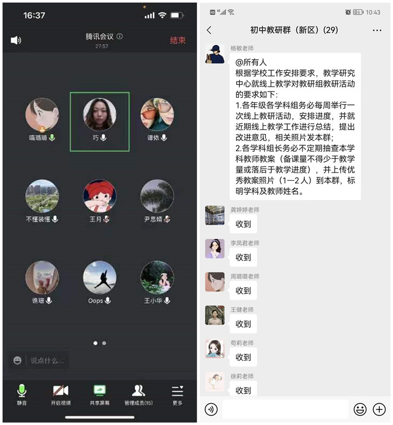 “延期不延教,停课不停学”,线上教学在初2025级各位领导、老师和学生的共同努力下已顺利进行。在全天的授课过程中,各位教师严谨负责,学生们精神饱满,课堂气氛活跃,教学效果良好。