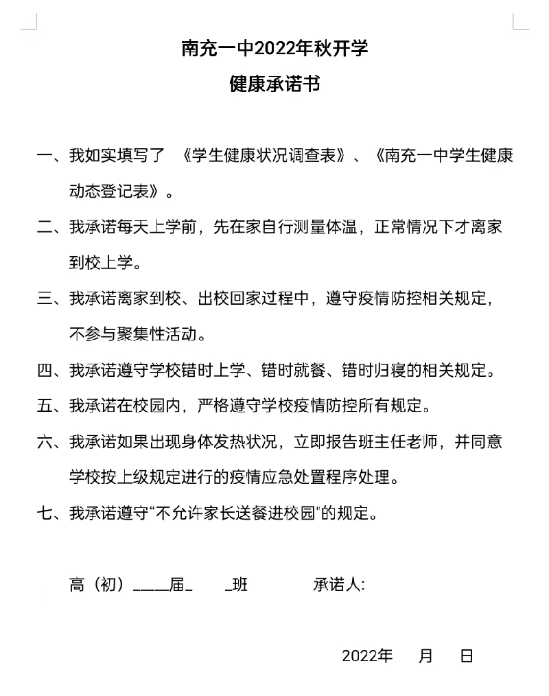 按防控要求:学校将严格校门管理,专用通道、排队测量体温进校。健康码、行程卡、核酸检测报告(48小时)、《学生健康动态登记表》(附件1)和《疫情防控承诺书》(附件2)请自行下载打印并如实填写,检查合格后方可进校。