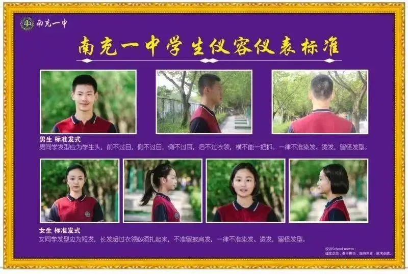 请各位家长提前督促学生整改,开学报到时将严格检查仪容仪表常规,如不符合要求将不予报到注册。南充一中学生仪容仪表要求: