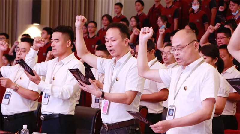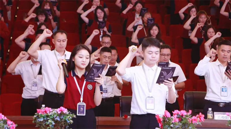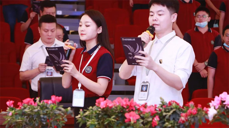 铮铮誓言彻宇内,切切决心奋前行。紧接着,领誓人蒋辉老师、龚婷婷老师带领全体初三教师进行宣誓。