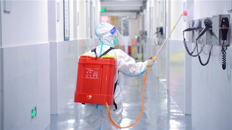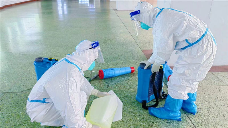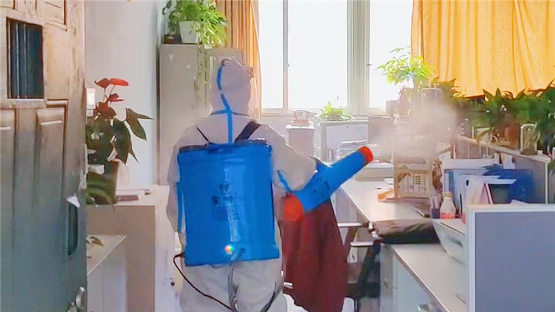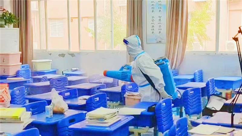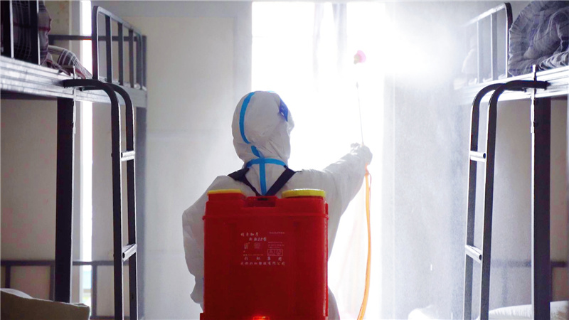 工作人员们身着厚重工作服,佩戴防疫口罩、手套,背负数十斤重消杀器械,穿梭在校园每一个角落,对室内外公共场所进行无死角消杀,对地面、墙壁、门框、把手、桌椅等进行地毯式无缝隙消毒,特别是对宿舍、教室、食堂等重点场所实施重点反复消毒消杀,力求不放过任何一个细节上的漏洞,切实做到校园消杀无死角、无盲区、全覆盖,最大限度地切断病毒的传播途径,为师生返校提供了有力保障。
