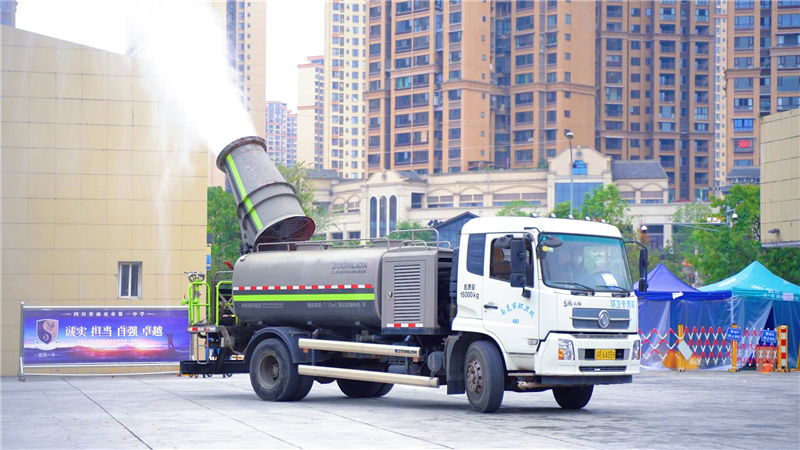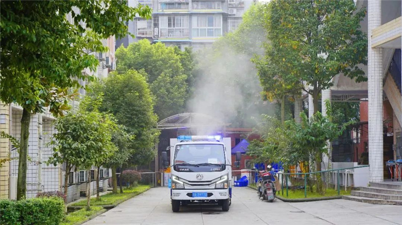 消杀现场,伴随着“隆隆”轰鸣声,雾炮车上的白色雾化消毒液喷涌而出。雾炮车可喷射100米远、30米高的水雾,覆盖面积大,消杀效果好,体现出了机动灵活、雾炮水珠细密、渗透力强、覆盖面大的优势,切实做到横向到边、纵向到底、不留死角,全力以赴织密扎牢疫情“防控网”。