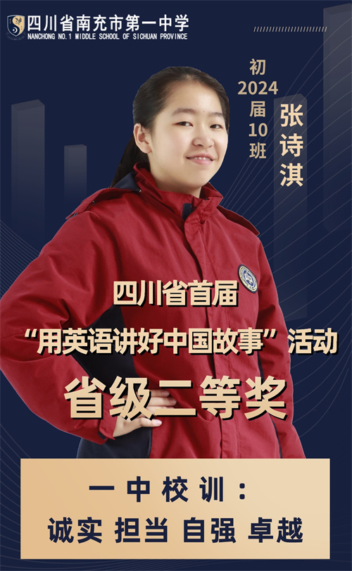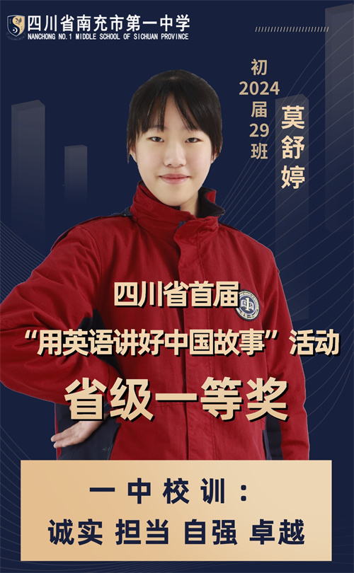 指导教师李晓翠评语:我们在平时的教学当中,非常重视同学们英语学科素养的培养,在积累一定量的英语单词的同时,对于同学们的发音和运用也进行了很多专业的指导。在这次演讲中莫舒婷同学不但英语发音标准、表达流利,而且落落大方,既展现了个人自信,又彰显了中国文化自信。给了我们很大的惊喜,也是很多同学们的学习榜样!