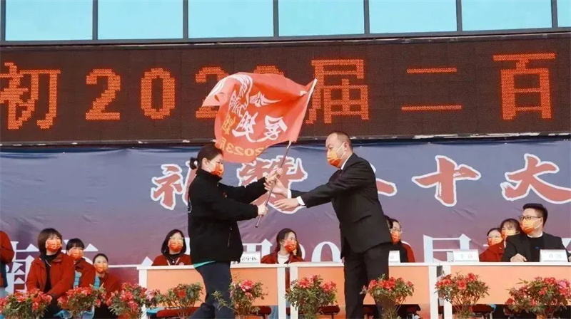 战旗迎风招展,指引前行方向。岳俊阳书记将战旗传给“蛟龙战队”年级主任张艳春,各班家长代表依次从张主任手里接过战旗 ,再郑重交予班主任。各班班主任高举战旗,振臂呐喊班级口号,声音一浪盖过一浪。接过战旗,我们就是战士!