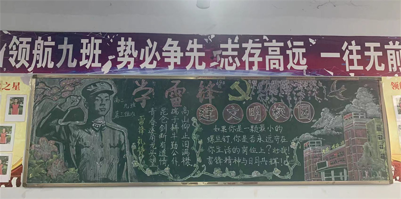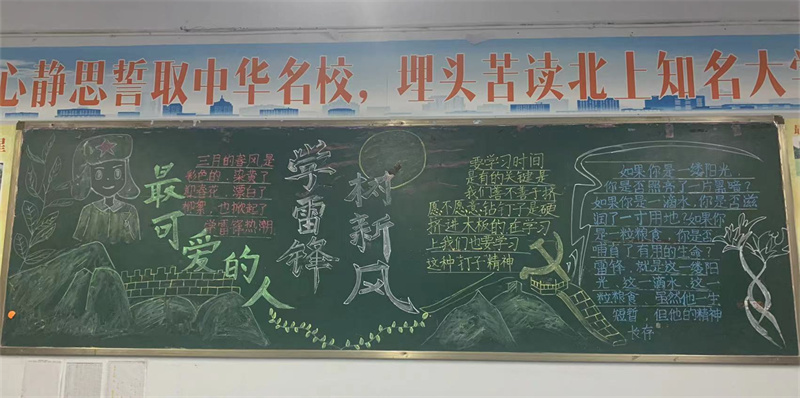 同学们相互协作,积极寻找素材,充分利用黑板报这块宣传阵地,介绍雷锋事迹,摘抄雷锋日记。设计的板报独特新颖、文字图画优美生动、色彩搭配创新合理,生动地展示了各班风采,为一中校园文化添了一道亮丽的风景线。